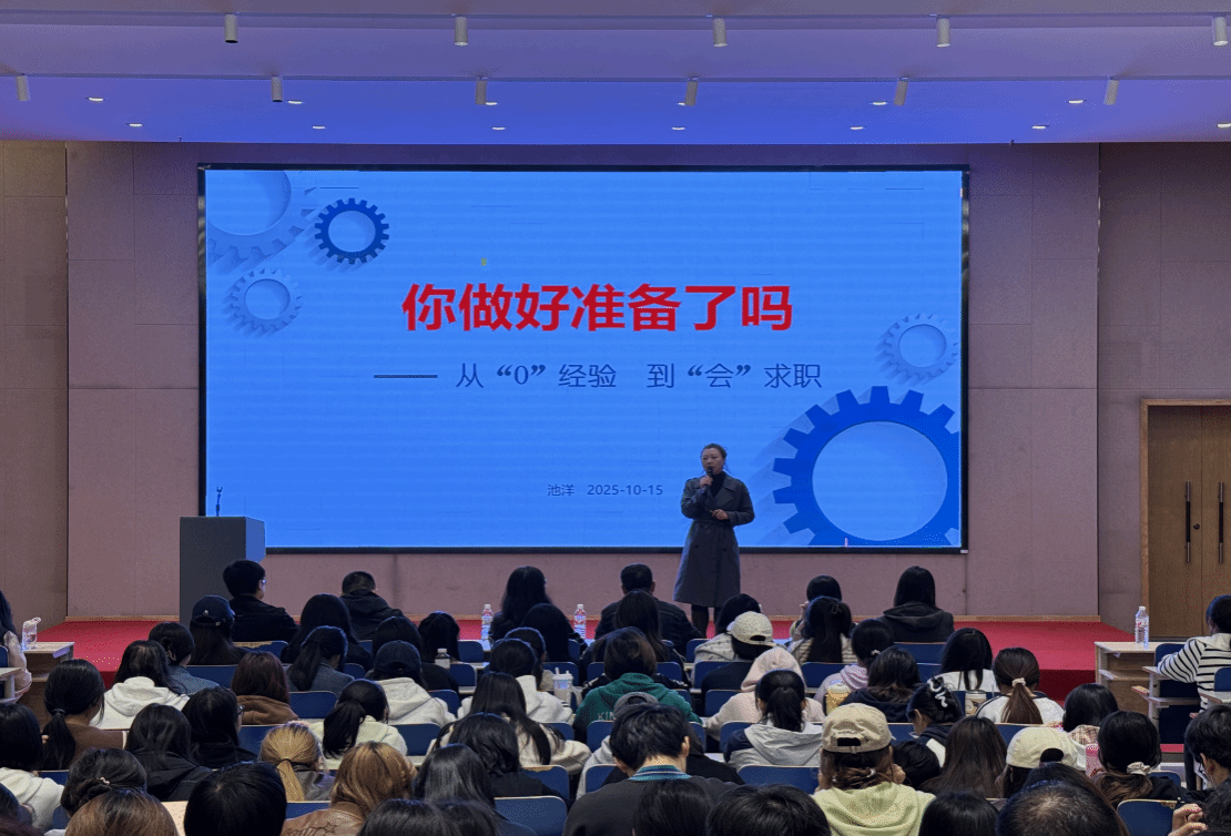 为提升学生的职业规划意识与求职竞争力,10月15日,经济管理学院在E1-4报告厅举办“求职基础:从‘0经验’到‘会求职’”职业指导报告会。本次报告会特邀智联招聘人才与发展中心高级面试官、西安市人才服务中心就业导师、陕西MBA联合会主席、国家级一级人力资源管理师池洋担任主讲。陕西服装工程学院一站式服务中心主任葛成,学院党委副书记王韬慧、团委书记郭亭亭以及2026届毕业生参加,柯文涛主持报告会。首先,池洋围绕“打造个人黄金名片—...