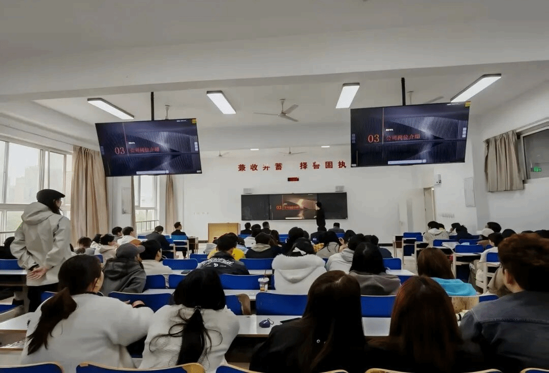 下午,学院特邀西安玖鼎筑家装饰有限公司走进校园,为环境设计专业的26届毕业生们带来了一场精彩的专场宣讲会。玖鼎筑家装饰有限公司的宣讲代表从公司文化、发展前景、业务板块及人才发展体系等方面进行了全面介绍,并向同学们展示了多个经典设计案例,生动诠释了公司的设计理念与实力。此外,公司还重点发布了针对应届毕业生的招聘岗位和实习计划,为同学们提供了清晰的职业发展路径。 在互动环节,同学们就岗位要求、薪资待遇、职业晋升通道等关心的问题踊跃提问,企业代表一一给予了耐心细致的解答。许多同学在现场就递交了个人简历,表达了强烈的求职意向。