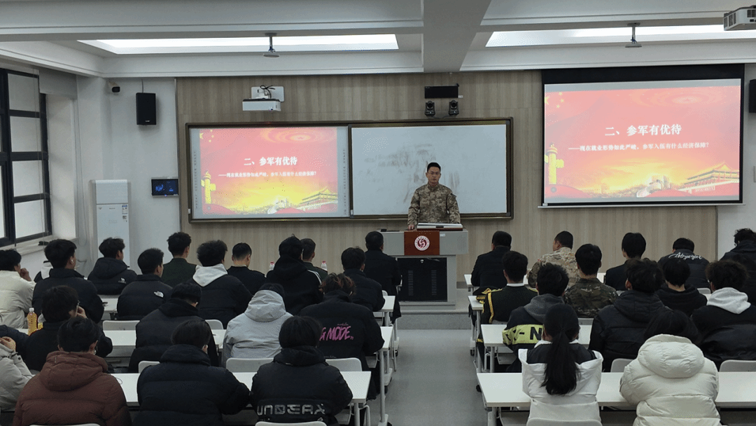 在政策解读环节,汪参谋结合2026年征兵最新政策,从年龄学历要求、身体政治条件、报名应征流程等基础信息入手,重点解读了大学生入伍的专项优待政策。针对学生最为关心的学业保障、经济补贴、发展前景等问题,他详细介绍了学籍保留、学费补偿、考研加分、专升本免试、就业扶持等核心政策,用“政治账、经济账、成长账”的清晰逻辑让同学们切实感受到参军入伍的多重优势。
