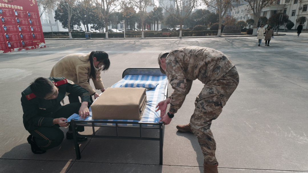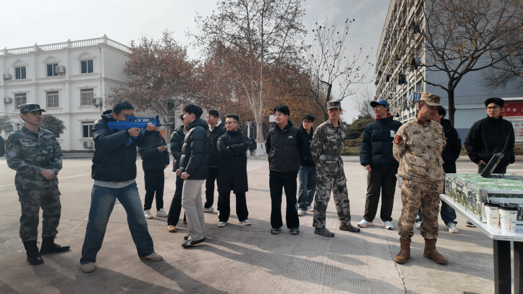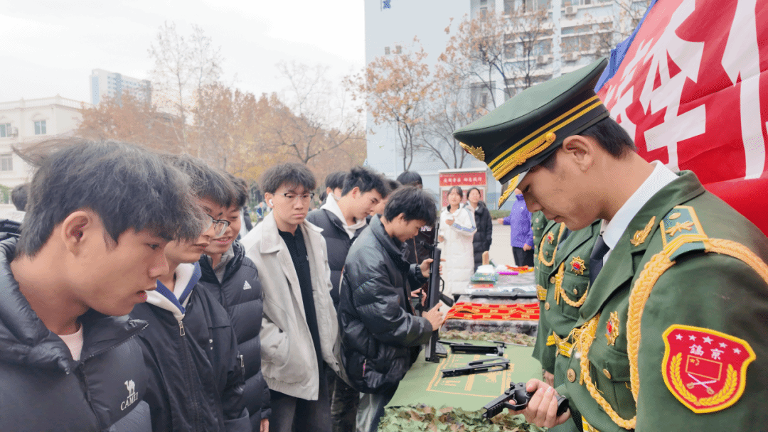 作为上午活动的亮点,军事活动体验区成为最受学生欢迎的“打卡地”。现场设置了基础战术姿势体验、模拟电子打靶、卫生救护、内务整理、92式手枪和95式自动步枪拆解结合以及军事知识有奖问答等互动项目,由退役复学大学生志愿者担任指导,带领同学们亲身感受军营氛围的魅力。生动有趣的体验活动让抽象的军营生活变得具象可感,有效激发了学生的参与热情。